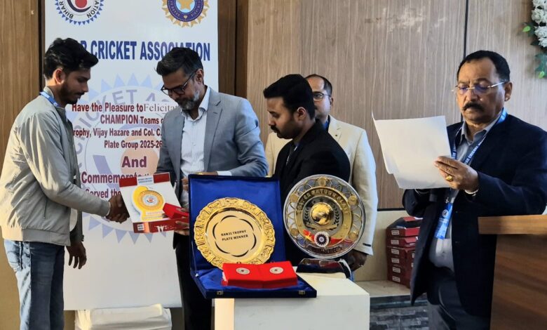 Patna: रणजी ट्रॉफी सत्र 2025/26 के प्लेट ग्रुप में बिहार का प्रतिनिधित्व करते हुए खिताब जीतने वाली टीम के खिलाड़ियों व स्पोर्ट स्टाफ को उनके प्रभावी योगदान, अनुशासन और टीम के प्रति निरंतर समर्पण के लिए बिहार क्रिकेट एसोसिएशन द्वारा सम्मानित किया गया। इस सत्र के दौरान खिलाड़ियों ने सामूहिक प्रयास, निरंतरता और संतुलित प्रदर्शन के माध्यम से प्रतियोगिता में भाग लेते हुए बिहार क्रिकेट की संरचना को मजबूती प्रदान की।